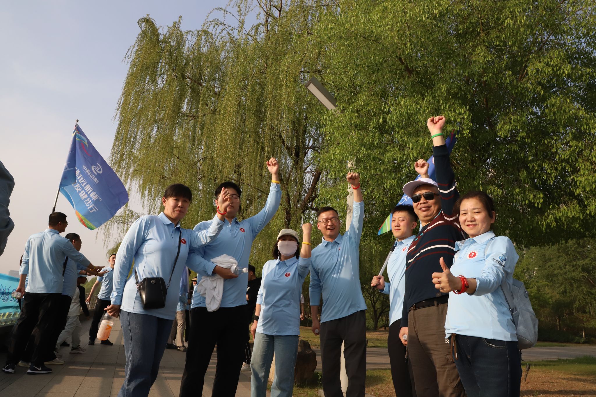 下午四点半,校友和老师们便早早地来到滨河公园跻汾桥东岸码头集合签到,统一着装。五点整,健步走活动正式开始。