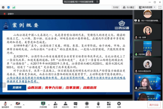 11月5日下午,按照任课教师薛继东博士的安排,2022级MBA6班管理学课程案例赛如期举行。受疫情影响,本次大赛采用线上方式进行,原俊俊同学担任大赛主持人。