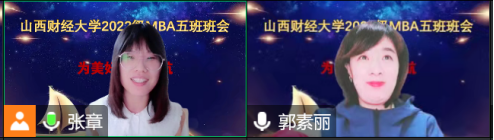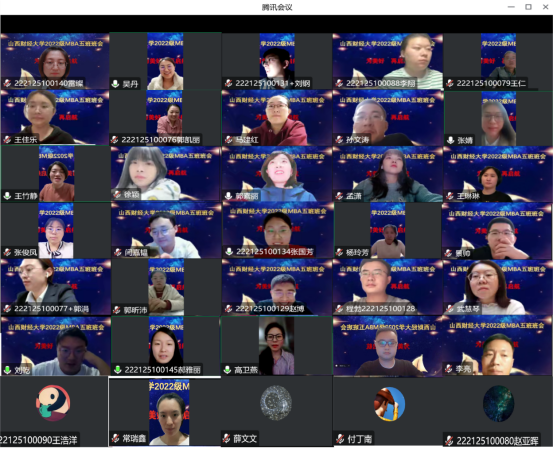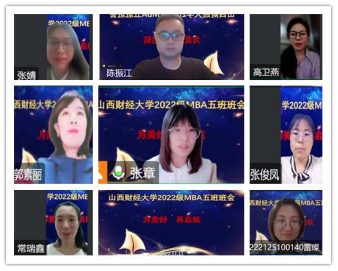 2022级MBA5班召开了主题为“为美好,再启航”的线上班会。班会由班长郭素丽主持,班主任张章老师出席会议。因为疫情原因,开学后同学们未能线下见面,虽然通过一个多月的线上课程,同学们之间有了一定程度的了解,但通过此次班会,全班同学共同交流、讨论并展望了财大MBA生活,大家彼此之间的感情更加深入。