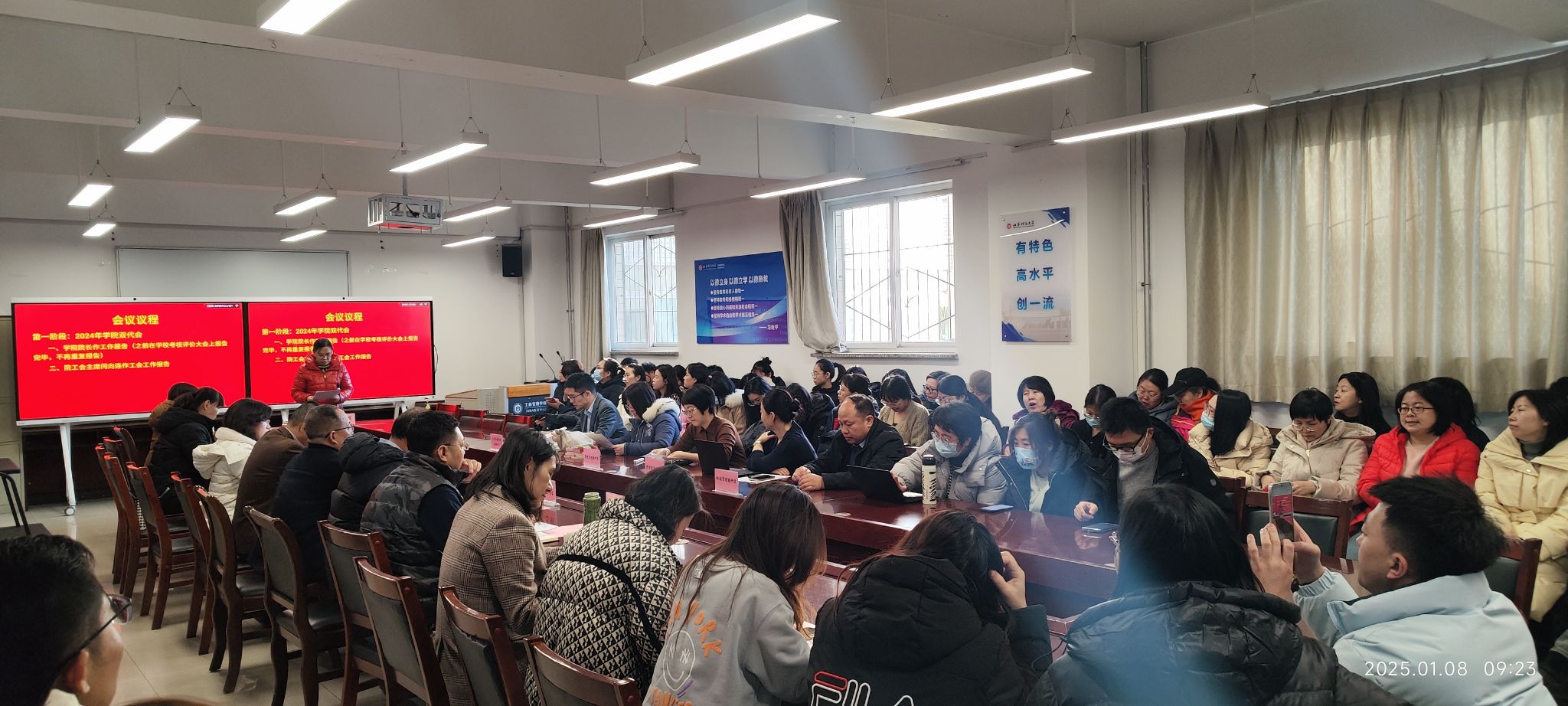 会议分两个阶段进行。第一阶段为2024年学院双代会。院工会主席闫向连作工会工作报告。