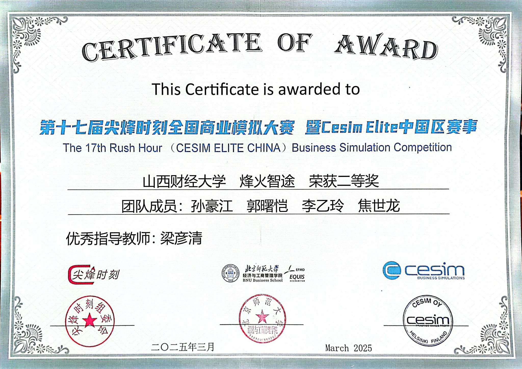 梁彦清老师指导的“烽火智途”队(团队成员:商业领导力微专业和2023级人力资源管理专业孙豪江、郭曙恺、李乙玲、焦世龙)脱颖而出晋级全国总决赛,并斩获本科组全国二等奖和尖烽海报奖,梁彦清老师荣获优秀指导教师奖。