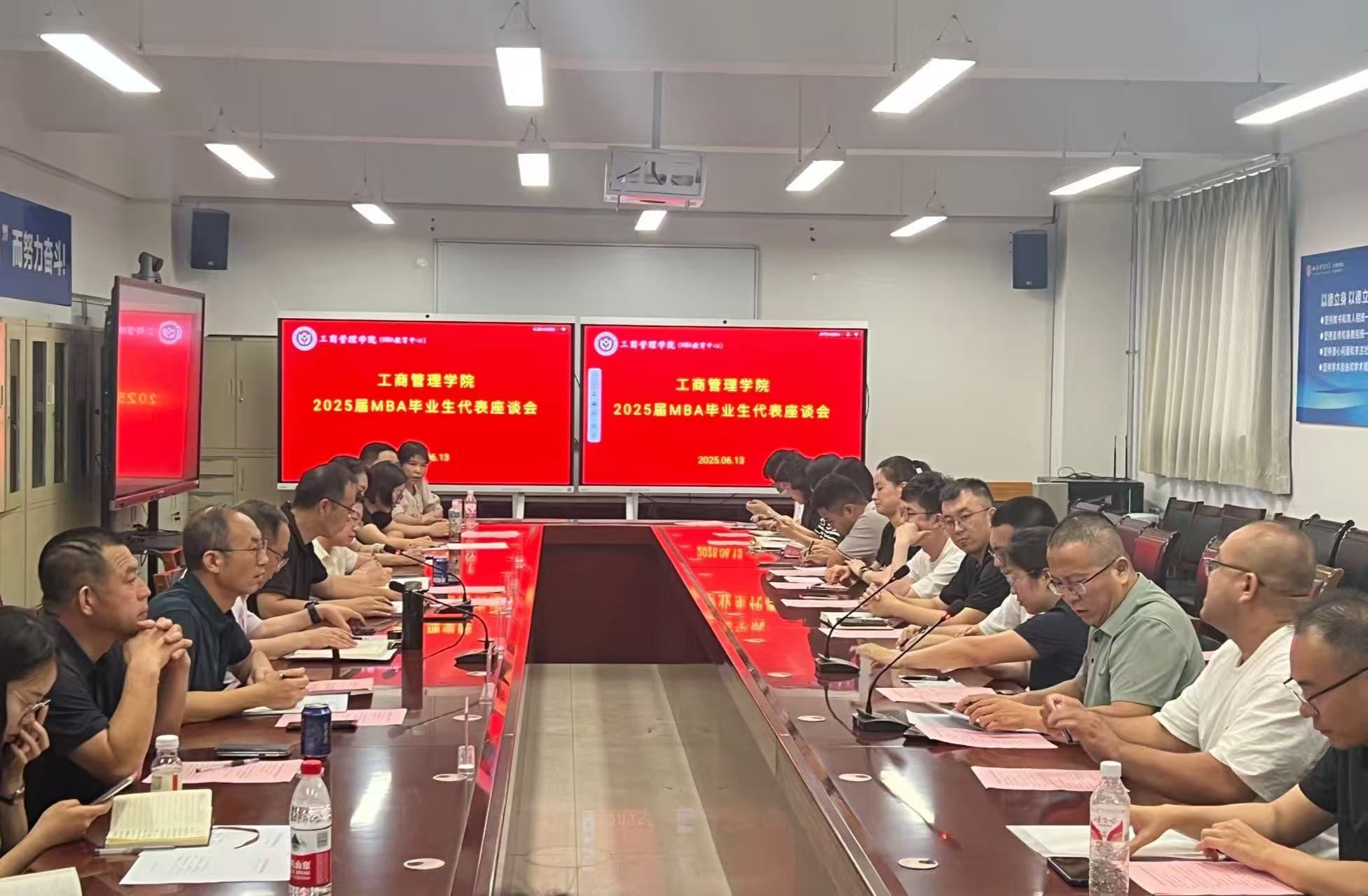 在会议室举行2025届MBA毕业生代表座谈会。学院领导、MBA校友会会长、MBA校友会秘书长、MBA教育中心工作人员、2023级、2024级MBA班主任、2025届MBA毕业生代表、MBA联合会代表等30余人参加会议。会议由学院党委书记李群生主持。