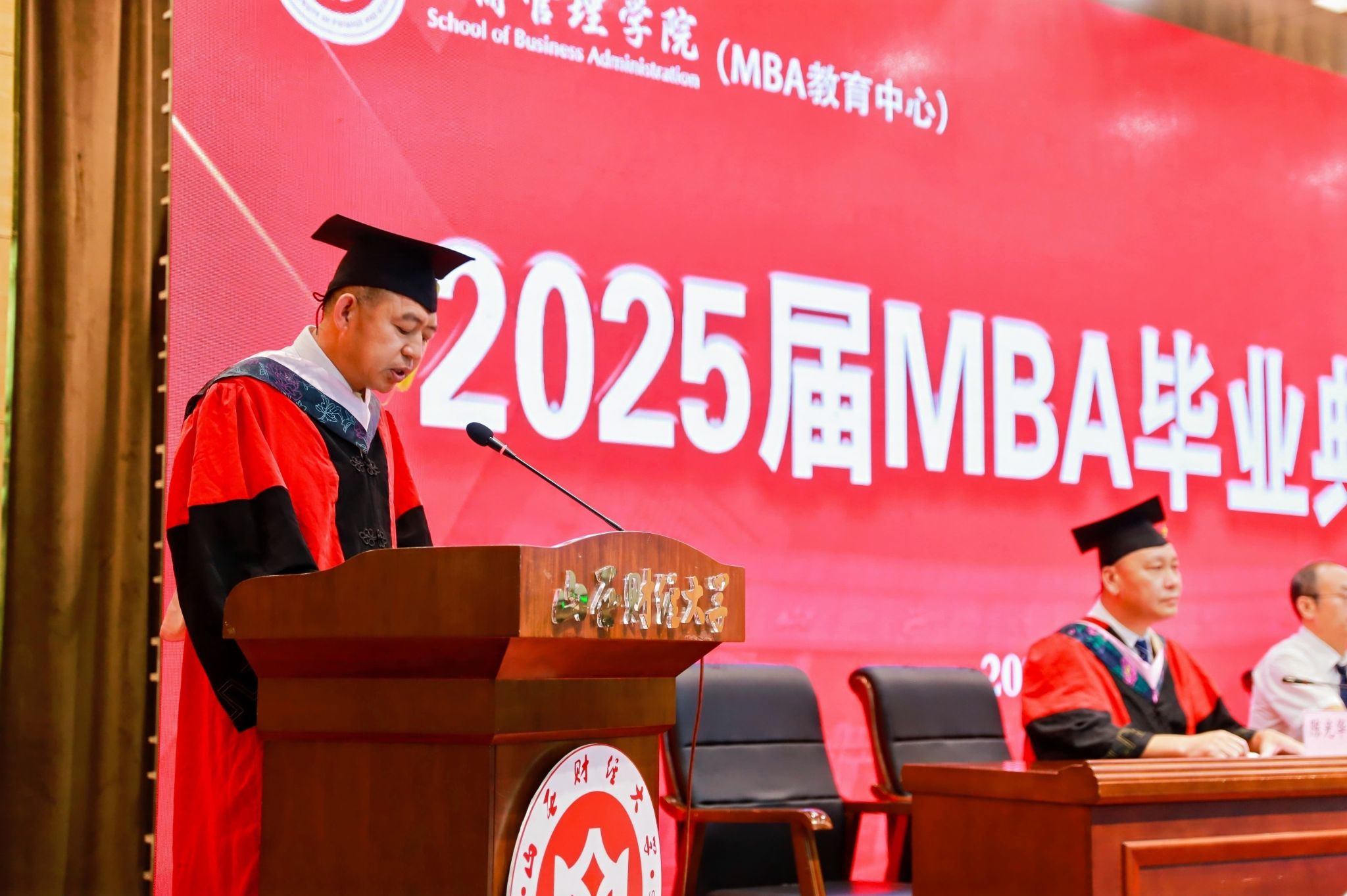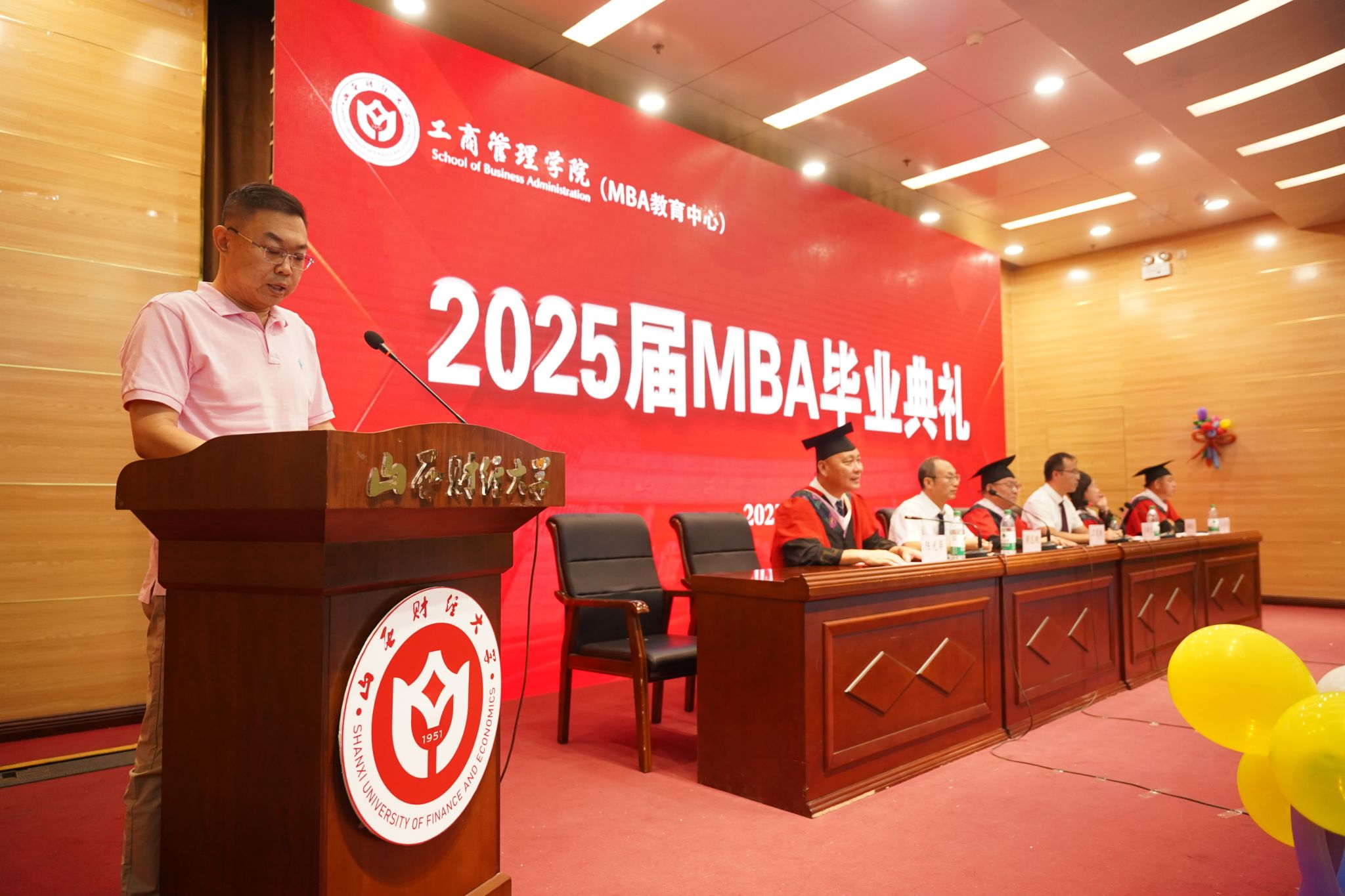 伴随着慷慨激昂的国歌,典礼正式拉开帷幕。学院院长卫虎林教授首先致辞,对2025届207名MBA毕业生顺利完成学业表示祝贺,对18位校级优秀毕业生和22位院级优秀毕业生表示肯定。他回顾了我校MBA教育项目二十五载发展历程中在人才培养、学科建设、服务社会等方面的成绩,向毕业生提出四点期望:一是以晋商精神立心,做转型发展开拓者;二是以校训精神立身,做终身学习践行者;三是以责任担当立行,做社会价值创造者;四是以家国情怀立命,做新时代奋斗者。最后,卫院长深情嘱托毕业生铭记“只要想念就会相见”的约定,祝愿大家在工作中劈波斩浪、勇毅前行。