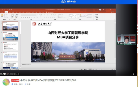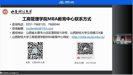 副院长、MBA教育中心执行主任薛继东应邀参加了由中国MBA教育网在线举办的“第五届MBA项目联展暨2022招生政策发布会(华中地区专场)”活动。本次活动主要从考生角度出发,对我校2022年MBA项目的招生信息、报考理由和培养流程等与考生进行了分享,并举行线上答疑。