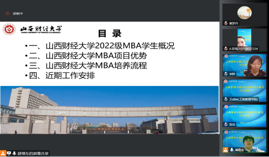 2022级MBA新生入学教育通过线上腾讯会议进行。9月17日晚上19:30,学院领导班子全体成员、MBA教育中心全体工作人员、2021级班主任、2022级班主任和2022级MBA新生参加了会议。会议由学院党委书记高岳主持。