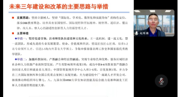 其次,赵琛徽教授就未来三年人力资源管理专业建设和改革的主要思路和举措进行了汇报。他指出,专业建设和改革必须坚持立德树人,坚持“国际化、学术化、数智化和实践导向”的特色定位,落实OBE教育理念,培养具有家国情怀、国际视野和开拓精神,精管理、通经济、懂法律、尚人本、察人心的融通性创新型人力资源管理人才。此外,赵教授还提出了专业建设和改革的主要举措:他强调,专业建设应坚持党建引领、注重师资队伍建设和文化传承,加强科教协同、深化产教融合与经法管融通。为提升教学质量,他主张深化教学改革,打造金课并出版一流教材。同时,他强调专业应发挥辐射作用,与中西部地区共建人力资源专业与学科,以扩大影响力。此外,他积极响应国家重大需求和企业难题,推动科学研究再上新台阶。这些举措将有力推动人力资源管理专业的持续发展。