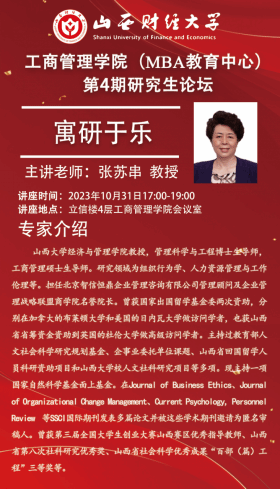 会议室开展第4期研究生论坛。山西大学经济与管理学院张苏串教授作了题为“寓研于乐”的讲座。漫小肆