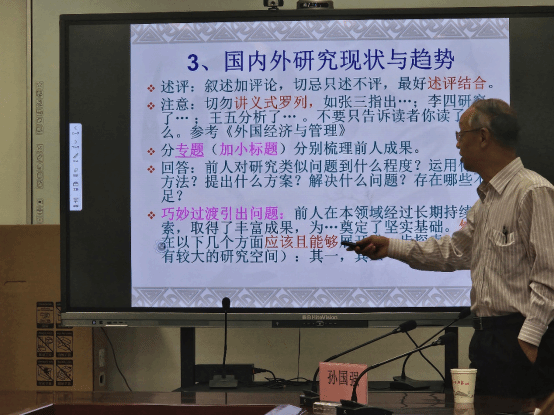 孙国强教授首先介绍了教育部人文社科项目写作模板,对申报书A表与B表的主要内容进行了简单说明。接下来,孙国强教授按照申报书B表的写作模板,就选题、理论与应用价值、国内外研究现状与趋势、研究目标和内容的重点难点、研究思路与进度、研究方法、研究基础及资料准备、中期、最终成果及去向、经费预算共十个部分进行了讲解,对每个环节的要求和标准、写作方法、写作技巧、注意事项等进行了详细的解读。随后,孙国强教授结合历年不同学科的立项率讲解了申报课题的学科选择。最后,孙国强教授从申报人条件、团队成员、申报书页面设计等角度提出了课题申报的一些注意事项。