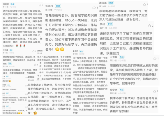 梅老师在结课寄语中表达了因疫情无法面对面交流的遗憾,指出课程结束并不意味着学习的结束,课程只是一个起点,更多的知识需要在课程结束后自主探索。并对同学们提出展望,希望大家通过两年的系统学习,积极思考,建立批判性思维,对问题形成自己的专业认知,构建一整套专业理论体系来指导实践,进而提升自身的专业能力和素养。最后,勉励大家“天之道利而不害,圣人之道为而不争”。