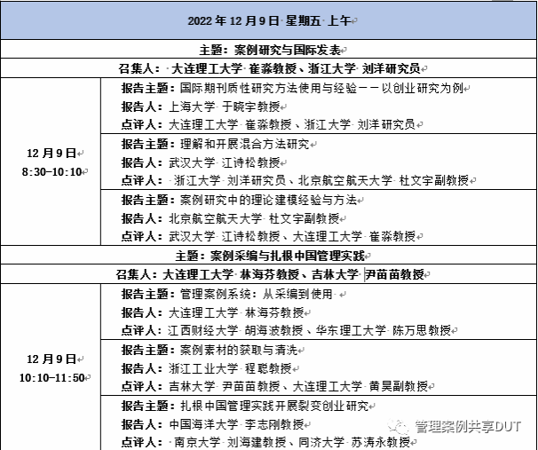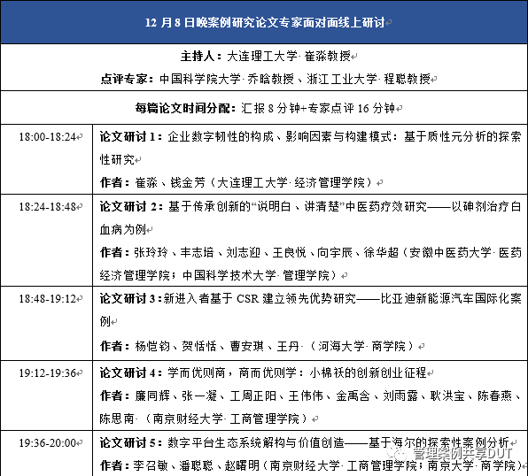 “主题报告”单元持续了一天半时间,来自全国各地的13位专家学者围绕“从诠释中洞察中国企业管理理论”“夯实方法论构建中国特色的管理学理论体系”“活动系统视角下的案例研究方法”“国内案例研究的近期态势、贡献与展望:以数字平台生态领域为例”“如何在洞察新兴实践中凝练科学问题”“如何与老师合作开展高质量案例研究”“国际期刊质性研究方法使用与经验——以创业研究为例”“理解和开展混合方法研究”“案例研究中的理论建模经验与方法”“管理案例系统:从采编到使用”“案例素材的获取与清洗”“扎根中国管理实践开展裂变创业研究”“案例教学的‘放’与‘收’”等主题做了报告。主旨演讲和主题报告单元都安排了点评嘉宾进行点评。会议还利用12月8日晚上的实践安排了“案例研究论文专家面对面线上研讨”。