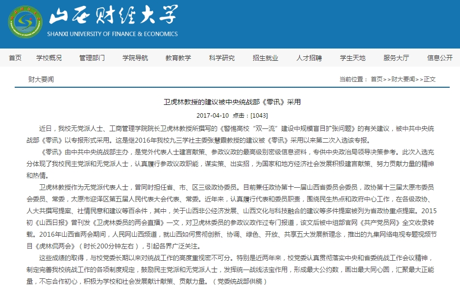 院长卫虎林教授所撰写的《警惕高校“双一流”建设中规模盲目扩张问题》的有关建议,被中共中央统战部《零讯》以专报形式采用。这是继2016年我校九三学社主委张慧霞教授的建议被《零讯》采用以来第二次入选该专报。