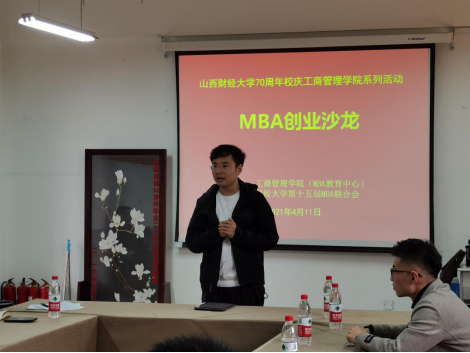 第十四届MBA联合会主席、2019级MBA校友、山西易飞创新科技有限公司创始人李明祚讲述了做教育培训、创业基地、无人机、境外医疗预约等项目的创业故事,并从“心态、能力、商业嗅觉”创业三要素向同学们分享了宝贵经验,以此赋能创新创业。