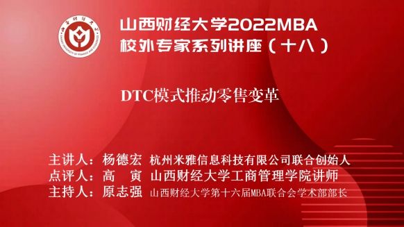 2022MBA校外专家系列讲座第十八期在“腾讯会议”平台圆满举办。杭州米雅信息科技有限公司联合创始人杨德宏博士带来了题为《DTC模式推动零售变革》的专题讲座,2021、2022级MBA学员、部分MBA教师、MBA校友等300余人参加,本期讲座还得到MBAChina网站的同步转播。