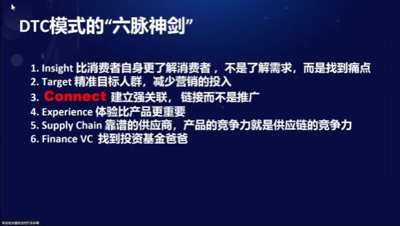 接下来,杨博士指出人类社会所有的交易都是围绕社会商品交换的三个要素——价值、公平、诚信来开展的。他认为技术是驱动行业发展的重要动力,在IT时代条形码的发明使得企业可以通过识别商品来进行库存管理,通过收集数据来精准营销,极大地促进了零售业地发展,创造了“啤酒+尿布”的营销神话。未来的DT时代将是云计算、大数据、移动、全渠道等先进技术驱动的,DTC模式就是这样一个被时代重塑的产物。他列举了近年来国内外发展较好的一些DTC品牌公司的业绩,用“六脉神剑(insight,target,connect,experience,supply chain,finance VC)”对其共性做出了归纳,详细阐述了DTC创业模式的7个关键步骤(仇恨清单,制造别致产品,破坏性市场测试,靠谱供应商,快速融资,爆炸式推广,公司售出变现),同时推荐了两本著作《DTC创造品牌奇迹》和《如何打造成功的DTC品牌》,并结合近日中央经济工作会发布的《扩大内需战略规划纲要(2022-2035年)》为我国目前的DTC发展模式指明了前进方向。