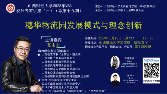 本期校外专家讲座,特邀山西穗华物流园张志杰董事长,为大家带来《穗华物流园发展模式与理念创新》的精彩讲座,线上及线下共有300余人参加,本期讲座还得到了MBAChina网站的同步转播。