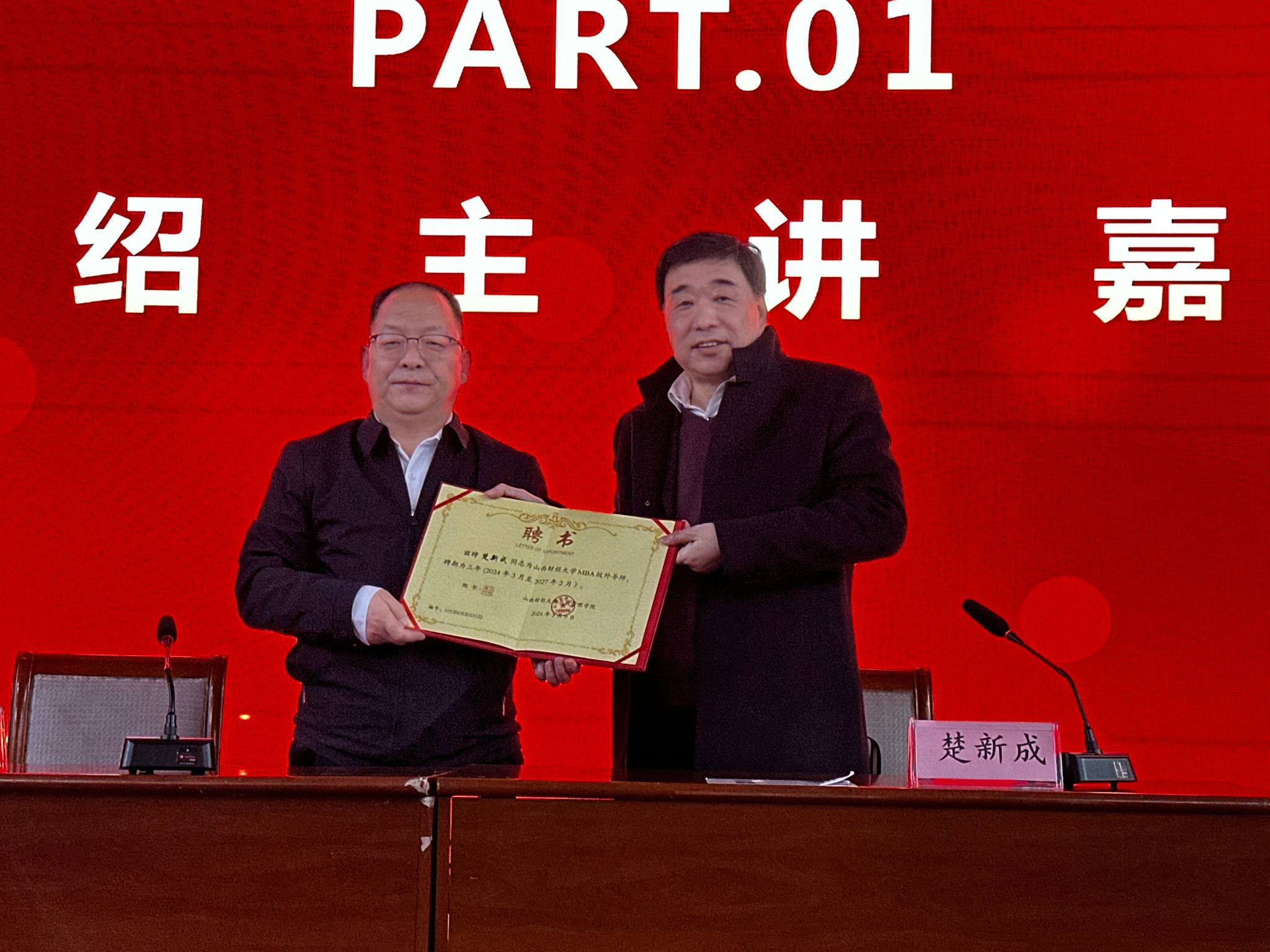院长、MBA教育中心主任卫虎林教授为楚新成先生颁发了MBA校外导师聘书。