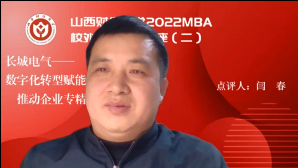 副院长、博士生导师闫春教授对本次讲座进行了总结,从战略思维、效果评价、未来趋势三个角度拓展了数字化转型的内涵,总结了从长城电气数字化转型之旅中受到的五点启发,将企业的数字化本质归结为人的数字化,同时就长城电气在未来的数字化转型过程中可能遇到的困难和挑战进行了分享,并祝愿长城电气在陈总的带领下披荆斩棘,与学院达成更深度合作,一起助力山西全方位高质量发展!